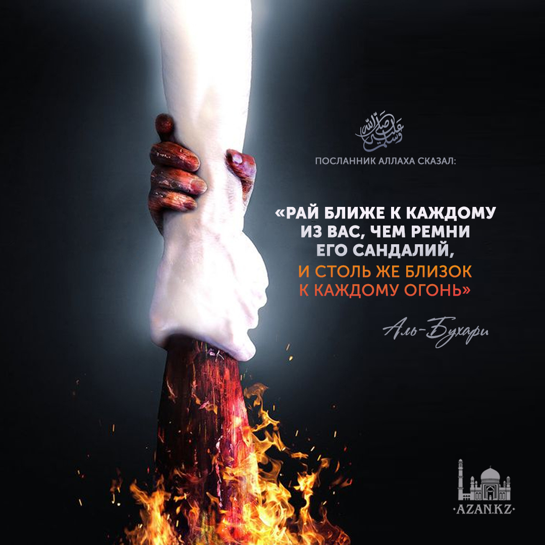 «Рай ближе к каждому из вас, чем ремни его сандалий, и столь же (близок к каждому) Огонь». (Аль-Бухари).