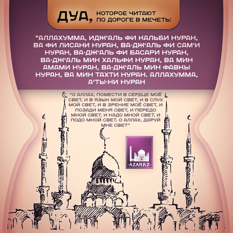 "Аллахумма, идж‘аль фи кальби нуран, ва фи лисани нуран, ва-дж‘аль фи сам‘и нуран, ва-дж‘аль фи басари нуран, ва-дж‘аль мин хальфи нуран, ва мин амами нуран, ва-дж‘аль мин фавкы нуран, ва мин тахти нуран. Аллахумма, а‘ты-ни нуран