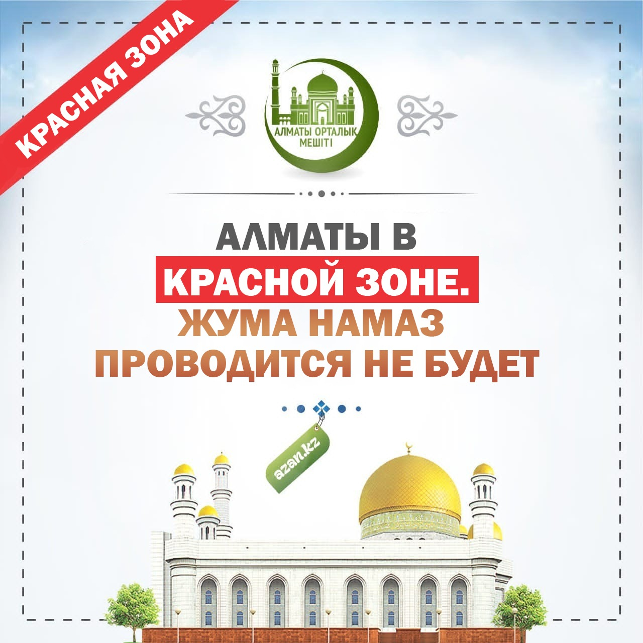 Город Алматы продолжает находится в красной зоне и, как следствие, сохраняется ограничение на проведение жума намаза. Просим отнестись с пониманием. Завтра, 2 сентября - жума намаз проводится не будет. При этом в мечетях города проводятся ежедневные пятикратные намазы с соблюдением социальной дистанции и санитарных требований.