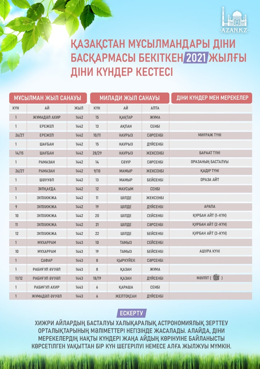 2021 жылғы діни күндер кестесі