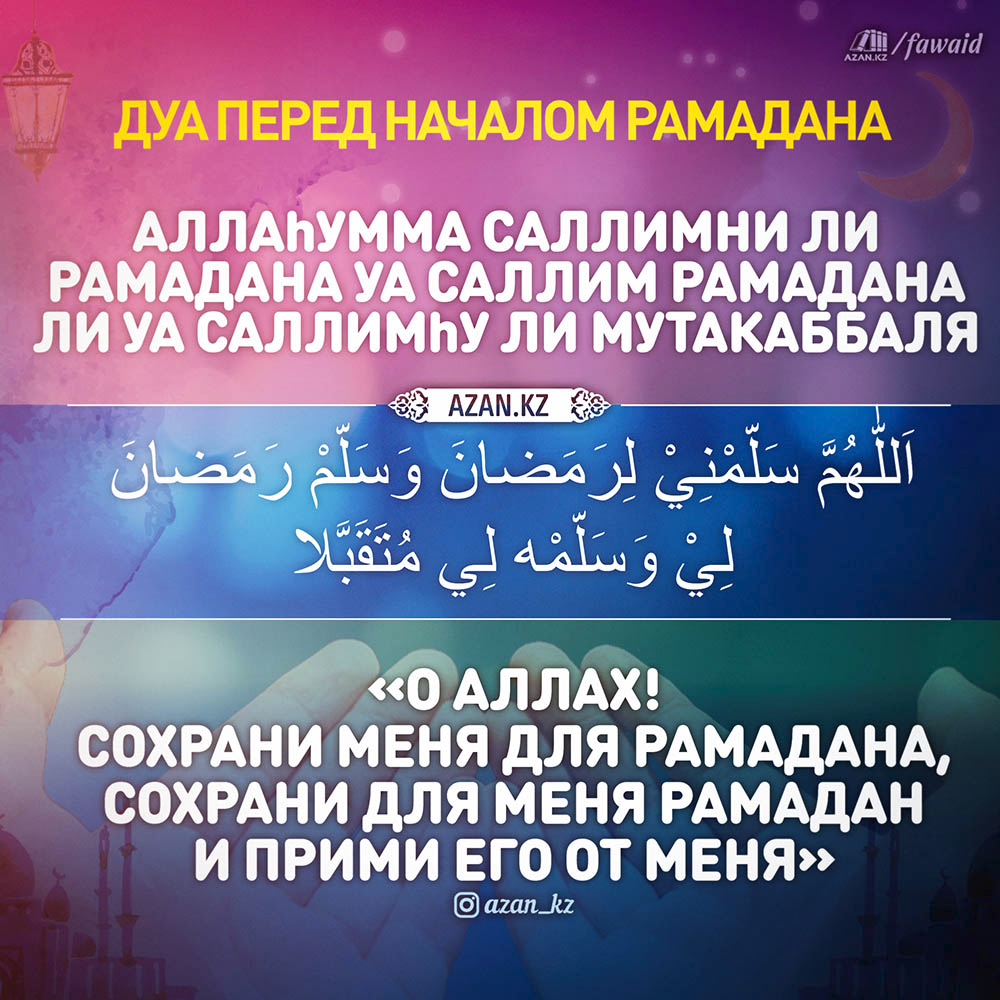 Перевод: «О Аллах! Сохрани меня для Рамадана, сохрани для меня Рамадан и прими его от меня».