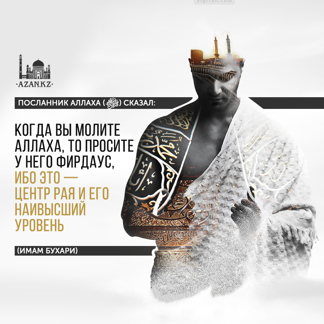 Сообщается, что Посланник Аллаха (да благословит его Аллах и приветствует) сказал: «Поистине, в Раю сто уровней, уготовленных Великим и Могучим. Аллалом для тех, кто следовал Его пути. Между каждым уровнем расстояние, словно между небом и землёй. Когда вы молите Аллаха, то просите у Него Фирдаус, ибо это — центр Рая и его наивысший уровень, над которым находится Трон Милосердного. Из него вытекают райские реки». (имам Бухари).