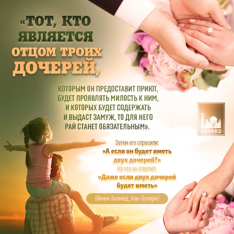 Посланник Аллаха ﷺ сказал: «Тот, кто является отцом троих дочерей, которым он предоставит приют, будет проявлять милость к ним, и которых будет содержать и выдаст замуж, то для него Рай станет обязательным». Затем его спросили: ««А если он будет иметь двух дочерей?». На что он ответил: «Даже если двух дочерей будет иметь» (Имам Ахамад, Аль-Бухари)