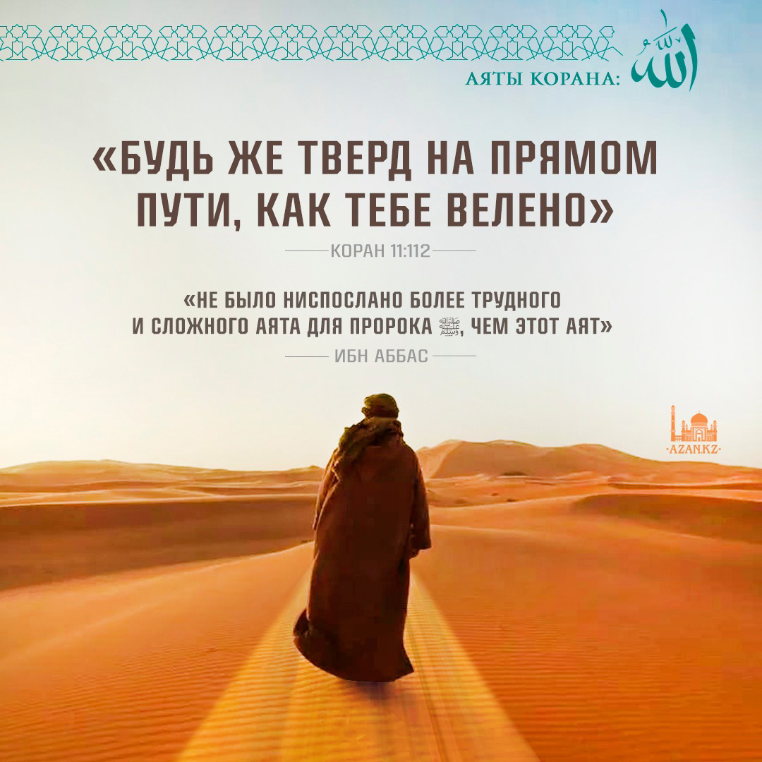 «Будь же тверд на прямом пути, как тебе велено, вместе с теми, кто обратился [к Аллаху]. И не преступайте [границ дозволенного], ибо, воистину, Он видит то, что вы вершите» (11:112)