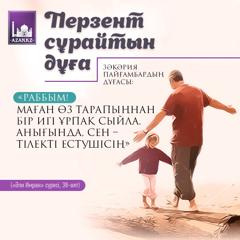 Мағынасы: «Раббым! Маған Өз тарапыңнан бір игі ұрпақ сыйла. Анығында, Сен – тілекті Естушісің» («Әли Имран» сүресі, 38-аят).